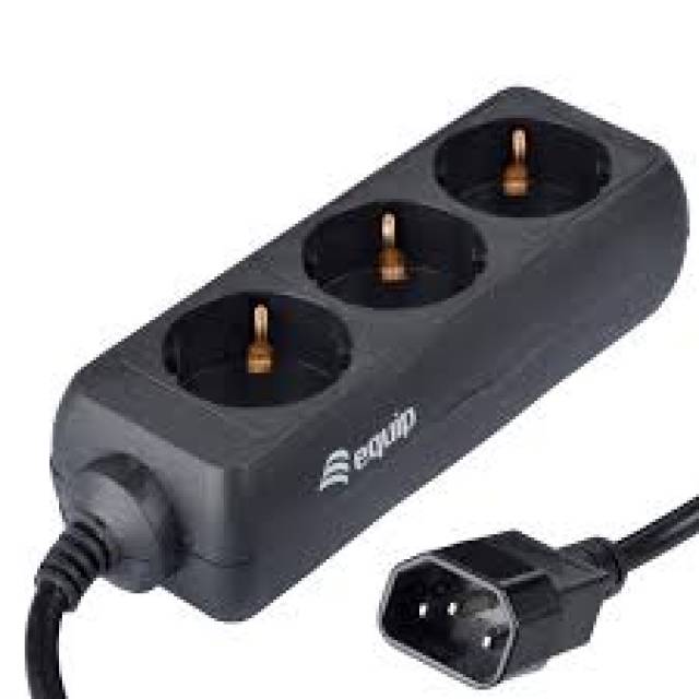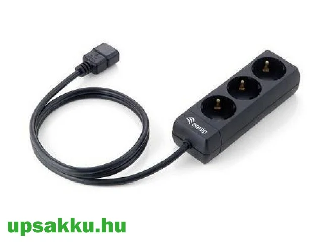 UPS-ek hátuljába dugható (C14-es csatlakozós) 3-as fekete Equip elosztó. 1,1m vezetékkel, max. 2200W terhelhetőséggel.